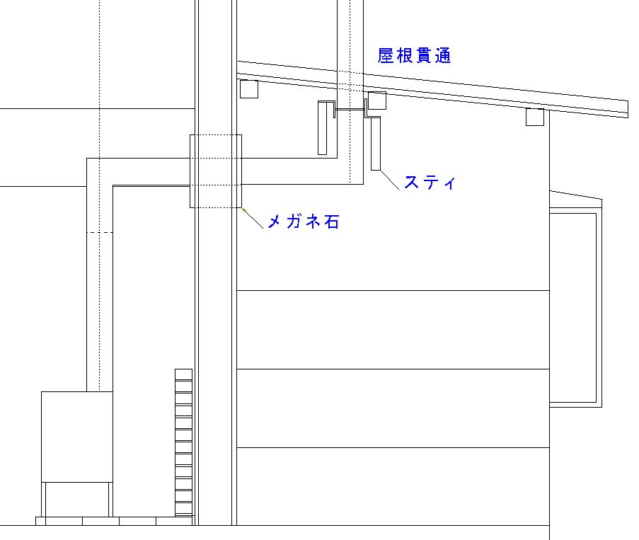 壁を抜いて、そのまま屋根まで伸ばしたいところですが、どうしても飛び出た書斎の妻側の屋根が干渉するため、屋根を抜かないといけません。